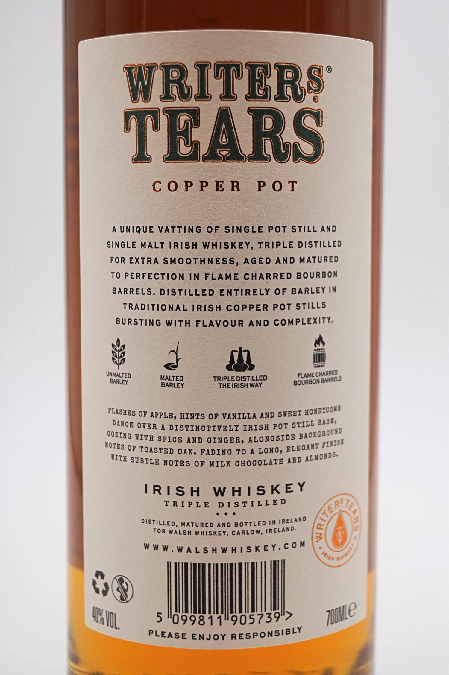 Writers ‚Tears wird dreifach destilliert, nicht getorft und gereift und in Bourbonfässern aus amerikanischer Eiche gereift. Er ist ein Goldmedaillengewinner bei der International Spirits Challenge in London und einer der bestbewerteten irischen Whiskys in Jim Murrays legendärer „Whisky Bible“. „Insgesamt ein sehr ungewöhnlicher irischer Whisky, ein Rückfall in das letzte Jahrhundert, in dem gewürzter Pure Pot Still Whisky verheiratet war Floral Single Malt ”- Jim Murray. Er wurde auch zu Ian Buxtons Veröffentlichung „101 Whiskys, die man probieren muss, bevor man stirbt“ hinzugefügt.