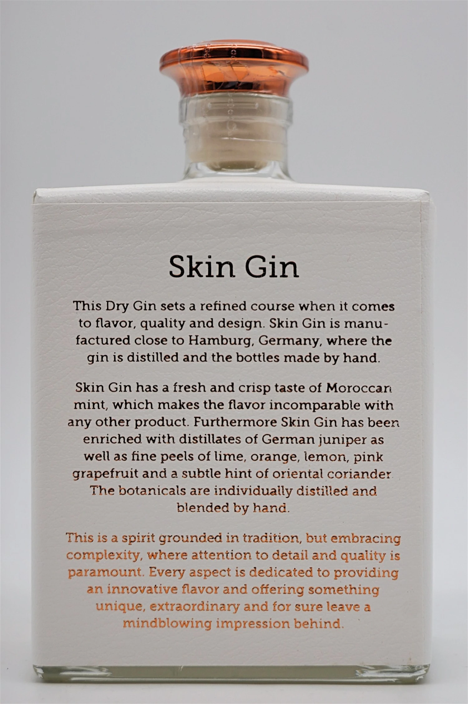 Die handverlesenen Botanicals werden im Alten Land vor den Toren Hamburgs in traditionellem Verfahren einzeln mit Quellwasser und Alkohol erhitzt und destilliert, um ihre feinen Essenzen nahezu 100% zu gewinnen und werden anschließend in „Skin Gin“ vereint. Es entsteht eine Spirituose außergewöhnlicher Qualität, die auch pur ein Genuss ist.