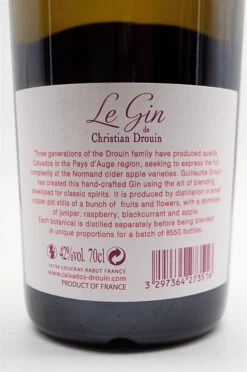 Auf Basis von Apfelwein überzeugt der Christian Drouin Le Gin Carmina durch seine herben und fruchtigen Noten. Der Cidre wird aus 30 verschiedenen Mostapfelsorten von den Apfelplantagen von Drouin destilliert. Sowohl süße, als auch saure und bittere Sorten werden für diesen ungewöhnlichen Gin verwendet.