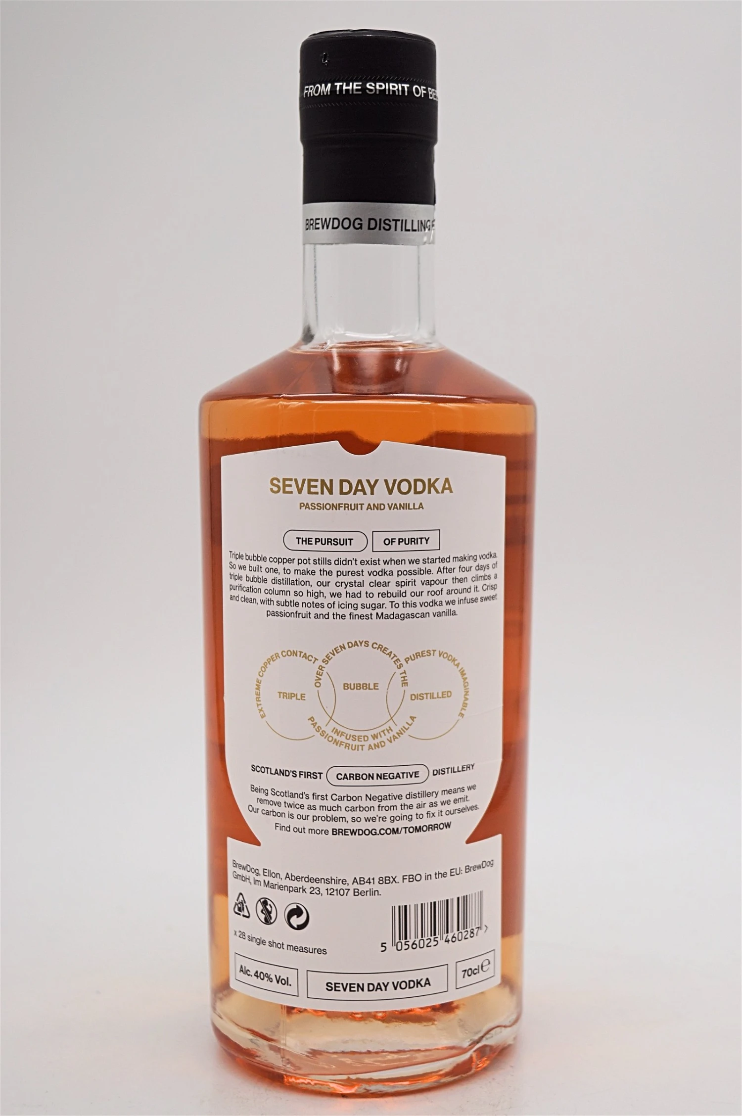 Wie schon der Rogue Wave Vodka wird auch der neue Seven Day Vodka Passionfruit and Vanilla über einen Zeitraum von sieben Tagen von BrewDog Distilling hergestellt. Auf Grundlage von Gersten- und Weizenmalz durchläuft der sogenannte Single Malt Vodka erst über vier Tage eine Triple Bubble Copper Pot Still und anschließend noch eine 19 Meter hohe Column Still. Filtriert wird ein einziges Mal