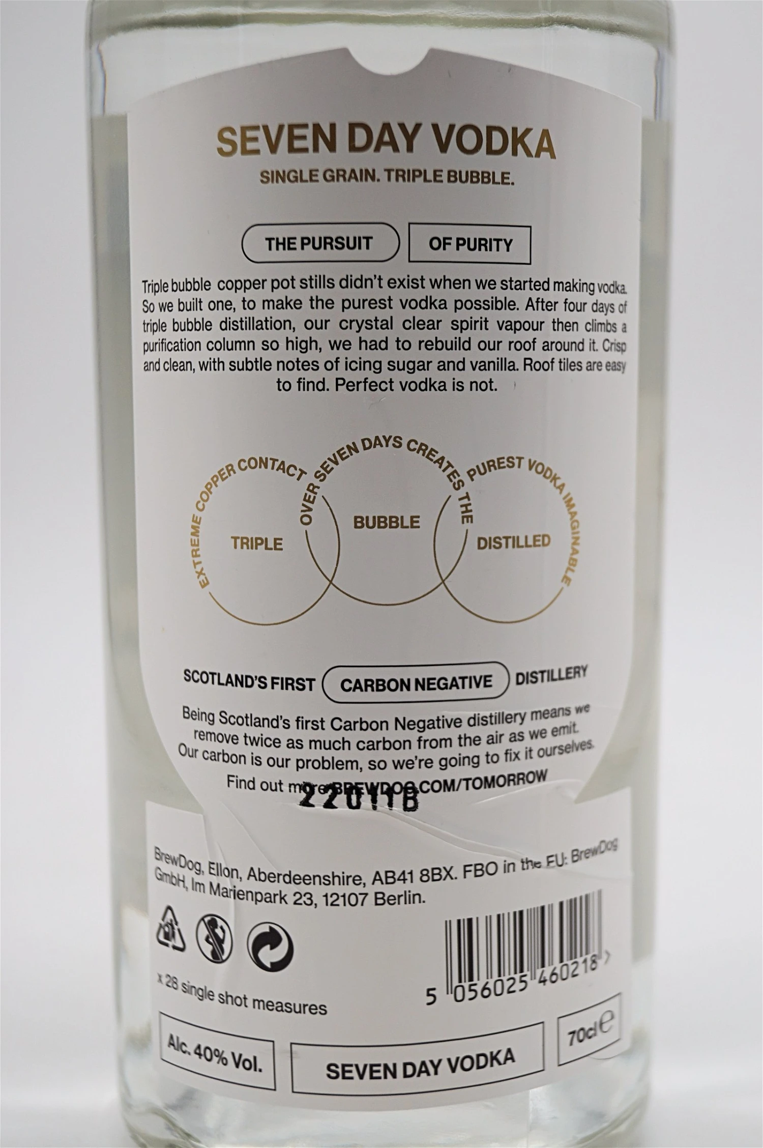 Wie schon der Rogue Wave Vodka wird auch der neue Seven Day Vodka über einen Zeitraum von sieben Tagen von BrewDog Distilling hergestellt. Auf Grundlage von Gersten- und Weizenmalz durchläuft der sogenannte Single Malt Vodka erst über vier Tage eine Triple Bubble Copper Pot Still und anschließend noch eine 19 Meter hohe Column Still. Filtriert wird ein einziges Mal