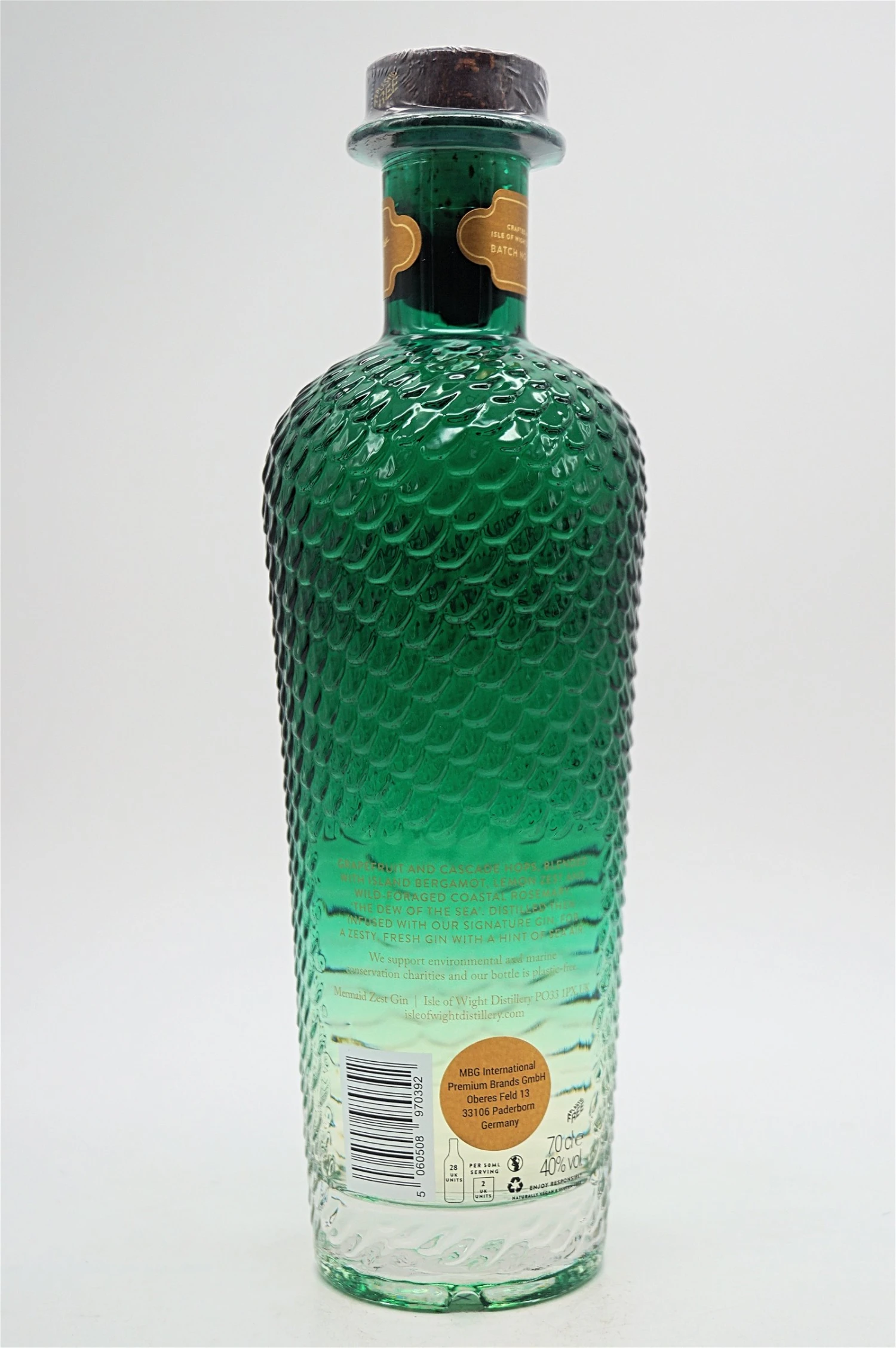 Inspiriert von der üppigen, grünen Insel, ihren Seegraswiesen und der natürlichen Welt, ist Mermaid Zest Gin in ein klassisches Smaragdgrün gehüllt. Angereichert mit Meerfenchel und Rosmarin von der Küste der Insel, mit Früchten, die im viktorianischen ummauerten Garten von Königin Victoria und Prinz Alberts Inselhaus Osborne House angebaut werden.